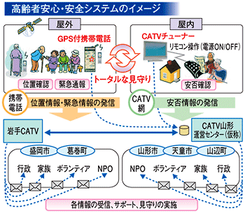 ケーブルテレビ山形(山形市)と、同社が大株主である岩手ケーブルテレビジョン(盛岡市)は、ケーブルテレビや携帯電話を活用し、高齢者の安否確認や位置確認、緊急通報など屋内外でのトータルな見守りを行うシステムの構築を進めている。