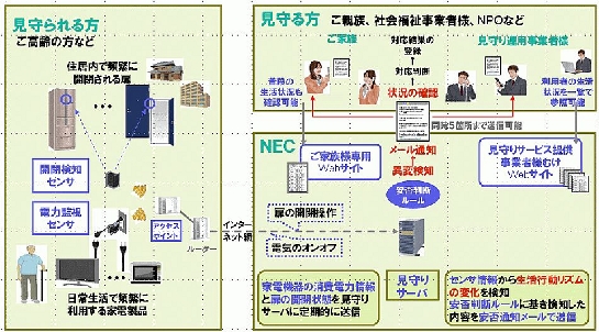 NEC は2011年9月15日、地方公共団体や企業向けに、高齢者の生活行動リズムを把握することで見守り支援をするクラウドサービス「e みまもり」を、10月1日から販売すると発表した。