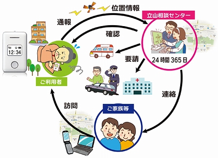 まもりんフォンは、利用者が緊急時にみまもりケータイの発信ボタンを押すと、立山システムが運営する「立山相談センター(コールセンター)」に直接つながる仕組みとなっている。立山相談センターでは、消防署に救急車の出動を要請するほか、地域の民生委員を現場に派遣するなど、利用者の状況に応じて対応する。自治体や病院、介護施設などは、みまもりケータイのGPS機能を使って、専用のウェブサイトで利用者の位置情報を検索することができる。