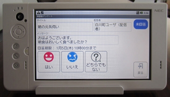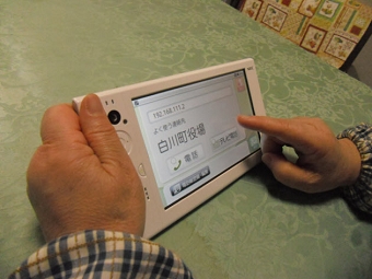 白川町は、2012年1月末から町内の35世帯にLifeTouchを配布する。このLifeTouchは、画面上のボタンの配置や文字サイズをカスタマイズし、電子機器に不慣れな高齢者世帯にも配慮したものだ。町からは、「朝食を食べましたか」といったメッセージを定期的に独居世帯のLifeTouchに送信する。各世帯は、画面上の「はい」「いいえ」などのボタンに触れるだけで、簡単に様子を知らせることができる。
