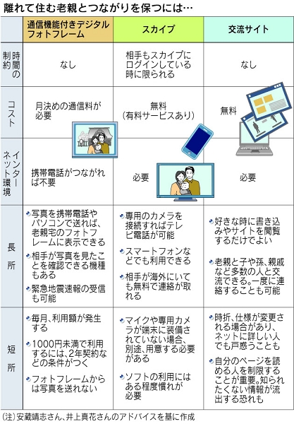 ただ、そこまでは必要ないという人も多いだろう。「ネットサービスの特性とパソコンに関する知識を考えて選べば、離れていてもコミュニケーションは深められる」と家電ジャーナリストの安蔵靖志さん。「相手が使えると思うサービスより、1段階わかりやすいものを選ぶのがポイント」とアドバイスする。
