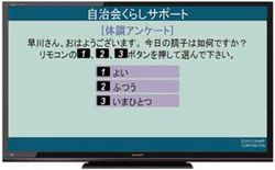 テレビの電源をONにすると自治会の掲示板に自動的にアクセスして地域情報を表示し、テレビの画面上に表示される「体調アンケート」で、その日の体調を「よい、ふつう、いまひとつ」から選択回答して連絡することが可能。