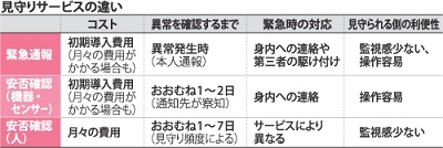 旭リサーチセンターの赤山英子研究員は「機械を介した見守りでも、駆け付けて対応するのは人間だし、緊急時の判断ができるのは身内だけ。どんな目的で、どんな内容のサービスが必要なのか、よく話し合うことが大事です」と話す。こうしたサービスは、利用する高齢者が「監視」と感じる場合もあるので、家族の意思疎通は事前にしっかりとしておきたい。【中村かさね】