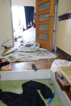 故人は60歳代の男性。一人暮らしのワンルームのアパートで、シャワーを浴びた直後に脳梗塞で倒れ、発見まで15日ほどかかった。遺品整理業者によると季節やケースによるが、10日以上かかると内臓が腐り始めるという。特殊な器具と洗剤で、部屋を清掃するが、発見までの時間がかかると臭いは消えず、部屋を使うのは困難だという。当日も不動産屋が不安そうに作業の様子を見守っていた。