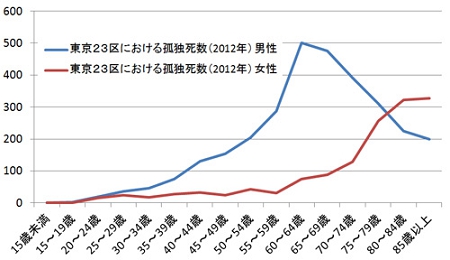 東京都監察医務院のデータによると、東京23区の孤独死数は2012年で4472人で、2003年に比べて56%増えている。高齢者が多いが、働き盛りの40歳代の孤独死が増えているのも見逃せない。特に40歳代の女性は約2倍にまでなった。遺品整理業者は「不規則な生活とストレスで若い人の孤独死は増加傾向にある。親が子供の遺品整理を依頼するケースも多い」と話す。