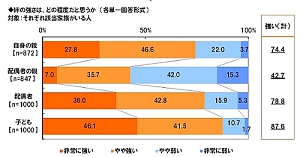 まず全回答者1,000名に、家族との絆の強さを尋ねたところ、「絆が強い」と答えた人の割合は、「自身の親」では74.4%、「配偶者の親」では42.7%、「配偶者」では78.8%、「子ども」では87.6%となった。