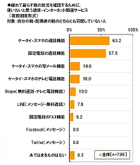 続いて、「親と同居していない」という789名に、離れて暮らす親の状況を確認するために使いたい“通信・インターネット関連サービス”を尋ねたところ、1位は「ケータイ・スマホの通話機能」で63.22%、2位は「固定電話の通話機能」で57.5%、3位は「ケータイ・スマホの写メール機能」で16.62%だった。