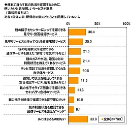 親の状況を確認するために使いたいサービスや商品を聞いたところ、1位は「親の様子をセンサーによって確認できる見守り・安否確認サービス」(30.4%)、2位は「見守りサービスも行ってくれる食事宅配サービス」(25.0%)、3位は「親の利用状況を確認できる通信サービスを備えた“家電”(電気ポットなど)」(21.5%)という結果になった。ドアの開閉を検知するセンサーや家電の利用状況の通知など、親のプライバシーを守りながら安否確認できる点が支持されているようだ。