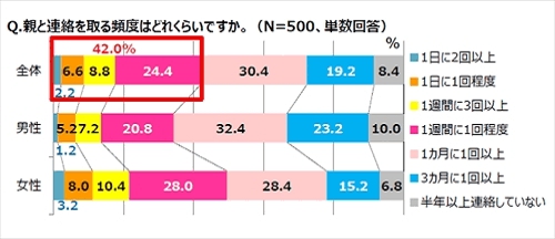 「親と連絡を取る頻度」について聞いたところ、最も多いのは「1カ月に1回以上」(30.4%)で、1週間に1回以上の頻度で連絡している人は42.0%だった。男女で比べると、女性のほうが頻繁に親と連絡を取り合っていることがわかったという。