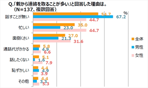 「親との連絡はどちらから取るか」という質問に対しては、40.0%が「自分からが多い」と回答した。「親からが多い」と回答した人にその理由について尋ねると、「話すことがない」「忙しい」「面倒くさい」などが上位となった。特に男性は、「話すことがない」と回答した人が67.2%と、女性よりも親との会話の話題に困っていた。