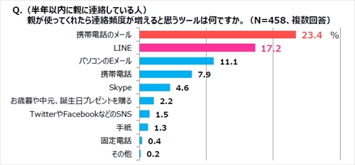 半年以内に親と連絡を取り合っている人に、「親が使ってくれたら連絡頻度が増えると思うツール」を聞いたところ、「携帯電話のメール」(23.4%)、「LINE」(17.2%)、「パソコンのEメール」(11.1%)の順となった。