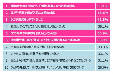 また、3人に1人以上が「火の始末や戸締まりをきちんとしているか」「空き巣や押し売り、強盗・ひったくりに狙われるのではないか」と、親の防犯事情を心配していた。