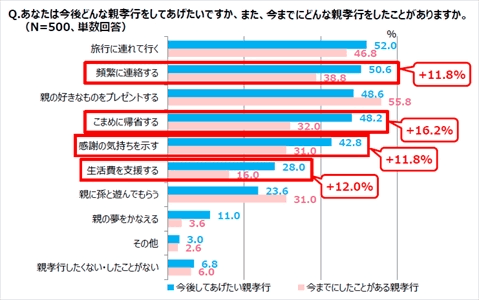 「今後してあげたい親孝行」と「したことのある親孝行」を比較すると、「今後はこまめに帰省してあげたい」と考える人が多く、「したことがある」との差が16.2%にのぼった。「生活費を支援する」「頻繁に連絡する」「感謝の気持ちを伝える」も12%の程度差があり、普段からできる、さりげない親孝行をしてあげたいと考えている傾向が見られたという。