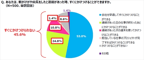 「親がけがや病気をしたと連絡があった時、すぐに駆けつけることができるか」という質問に対して、約半数の53.0%は「会社を早退してすぐに駆けつけることができる」と回答したが、37.0%は「仕事が終わった後」「連絡のあった週末に」「担当しているプロジェクトが完了したら」と回答し、「駆けつけることができない」(8.6%)と合わせると45.6%が、すぐに駆けつけられないことがわかったとのこと。