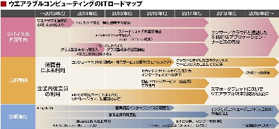 技術的な成熟に至る経路、普及までの課題を考慮して、ウエアラブルコンピューティングの今後を予測したものが「ウエアラブルコンピューティングのITロードマップ」である。