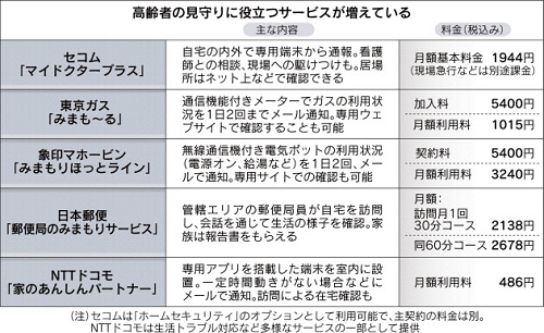 日本郵便は13年から「郵便局のみまもりサービス」を開始。郵便局員が月1回以上、高齢者の自宅に赴き、話し相手となるなどして様子をみる。結果は定型の報告書で受け取ることもできる。
