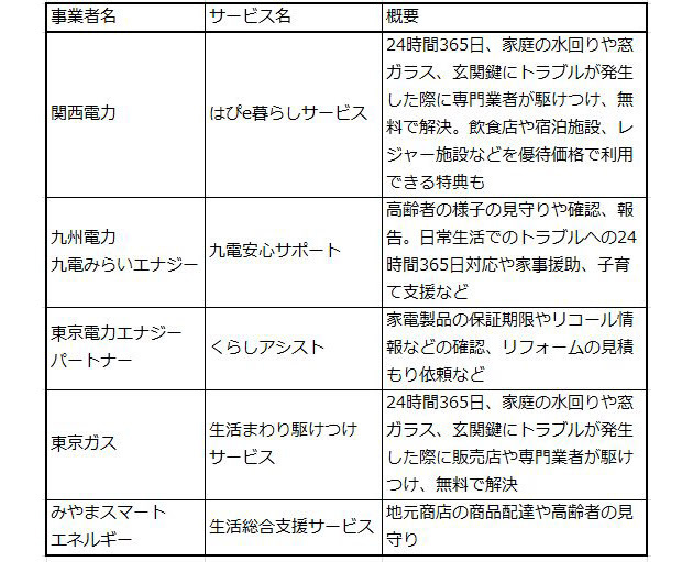 主に価格競争で攻め込む新規参入組に対し、電力大手は対抗策の一つとして顧客の生活支援サービスを打ち出している。専門のサービス事業者と提携し、電力大手の信用力をバックにした、“もしも”の時に備える安心・安全サービスを売り物にすることで、顧客の離脱を防ごうという狙いだ。